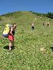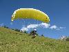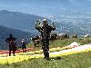 Après de longues hésitations, nous choisissons de monter décoller du sommet. La, nous nous préparons au milieu des vaches, avec lesquelles il faut négocier les quelques mètres carrés nécessaires. Le décollage dans cette une longue pente est une formalité pour tout le monde.