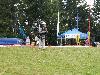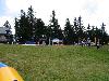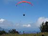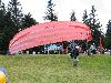 Pierre a assuré le spectacle en réalisant un vol en paramoteur, depuis le champ situé au dessus du déco officiel. Il faut dire que le vrai déco s'est avéré trop pentu pour un paramoteur. Pierre a donc pris son envol sur la zone plate située entre le parking et le déco. Il a réussi à trouver un axe de départ lui permettant d'éviter le parc gonflable des motos miniatures et les tables de pique-nique. Il s'est ensuite promené partout dans le paysage, afin de montrer aux touristes que notre club était à la hauteur (1560 mètres exactement, à ce moment-là).
